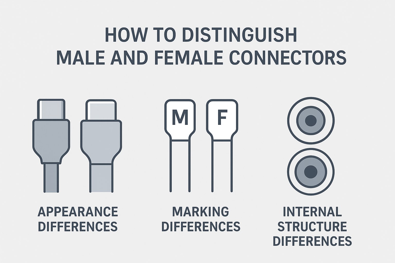 Connectors are essential components used to link two electronic devices or circuits. They are widely applied in communication equipment, 自動車システム, 家電, industrial control, and countless other fields. One of the most fundamental concepts in connector design is connector gender—the classification of a connector as either male or female. Correctly identifying the male and female ends is crucial not only for ensuring compatibility but also for preventing electrical failures, signal loss, or even safety hazards. This article explains how to distinguish male and female connectors from three perspectives: appearance, marking, and internal structure.