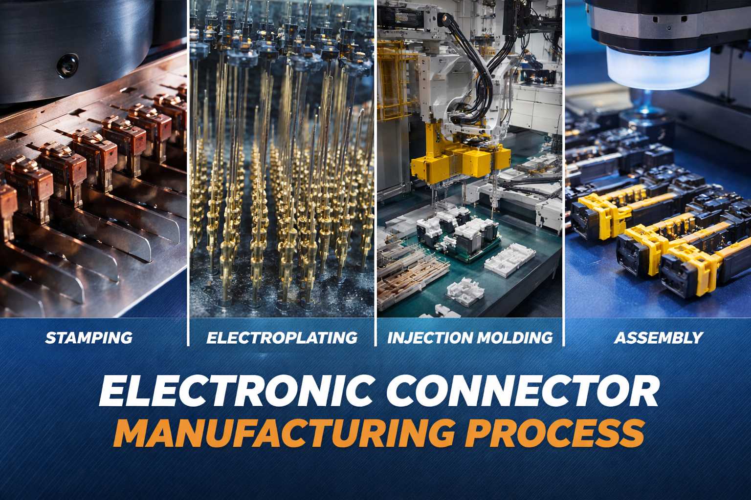 This article provides an in-depth look at the four major stages of connector production—stamping, electroplating, injection molding, and assembly—highlighting the technical requirements, quality challenges, and advanced inspection methods that support high-reliability connector manufacturing.